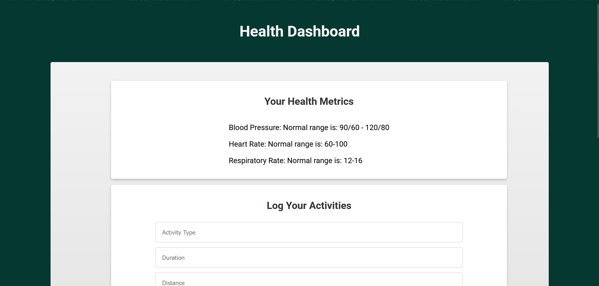 This project is an interactive health‑tracking dashboard that lets a user manage different parts of their daily wellness. It focuses on three main areas: health metrics, physical activities, and nutrition goals.