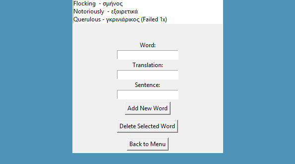 This project is an application designed to prepare the examinee for SAT vocabulary. Through this program, the examinee will be able to independently verify whether they have properly learned the new words they recently encountered. The examinee can choose the words they want to be tested on and, after each test, receive immediate feedback on any mistakes.